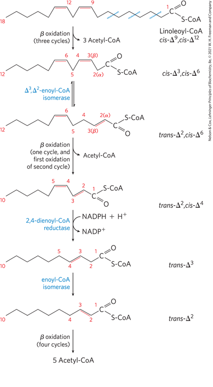 1) 포화지방산과의 차이: β-oxidation 위한 전처리 필요 (1) enoyl-CoA isomerase: ∆3 → ∆2 (2) 2,4-dienoyl-CoA reductase: ∆2,4 → ∆3 2) 에너지 생산: 4 ATP 손해 (FADH2 1개 덜 생산, NADPH+H+ 추가 소모) |