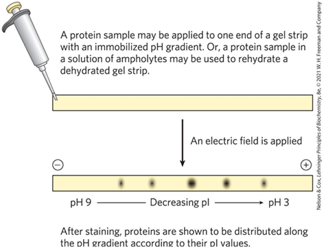 2) 과정: pH gradient가 있는 갤에 단백질 로딩 → pH=pI인 지점에서 이동 멈춤
