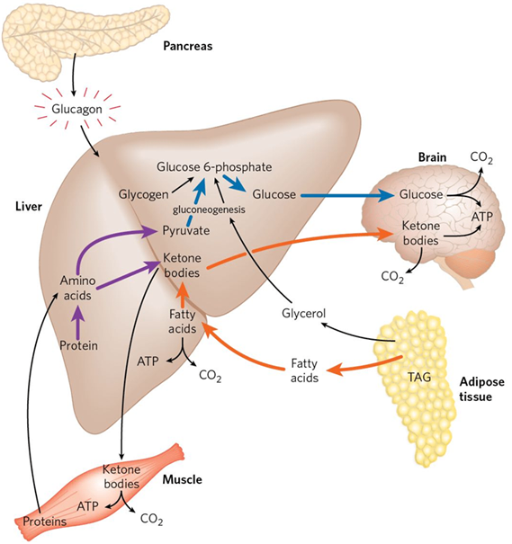 • 수용성 케톤체인 β-hydroxybutyrate, acetoacetate는 뇌의 에너지원으로 쓰이는 포도당 보조