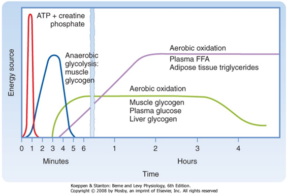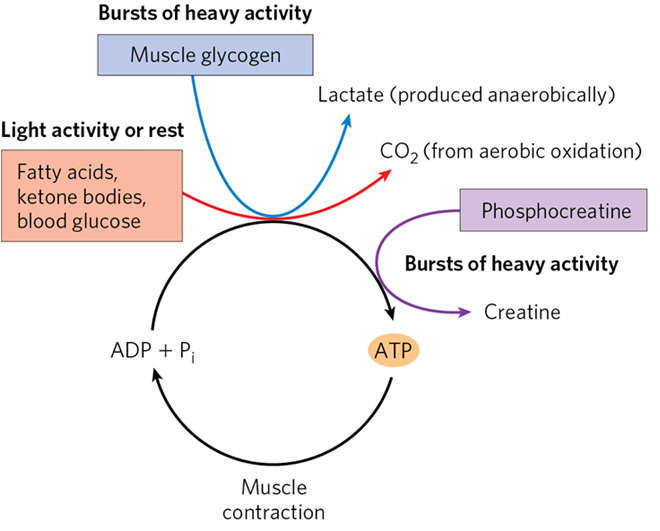 ① very intense, short-term exercise (10-15초 달리기): ATP + creatine phosphate