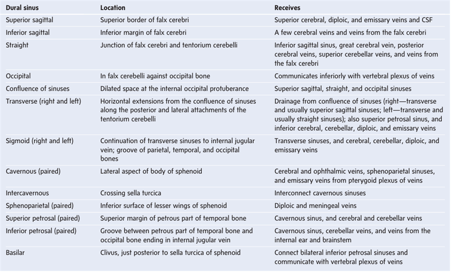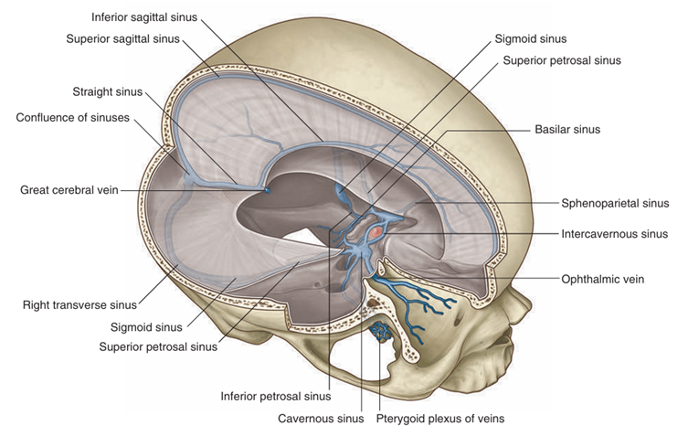 3) 흐름: 위/아래시상정맥굴(superior/inferior sagittal sinus) → 곧은정맥굴(straight sinus) → 정맥굴합류(confluence of sinuses)