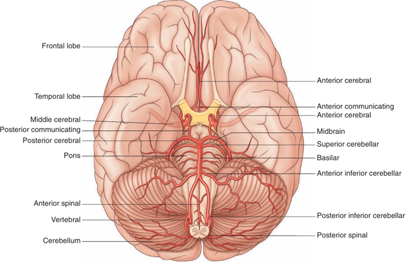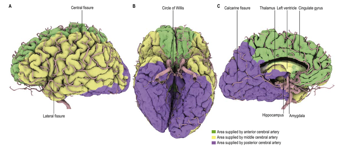 뒤대뇌동맥 | 뇌바닥동맥 ← 척추동맥 | 내측면: 후두엽, 측두엽 외측면: 후두엽 뒤쪽 |