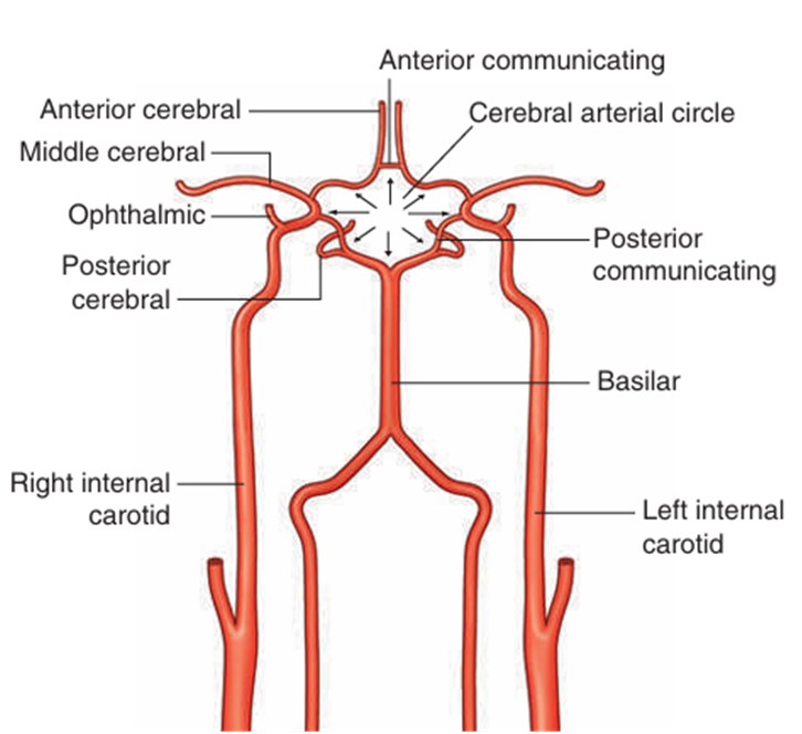 | ① 속목동맥(internal carotid a. ) ② 앞대뇌동맥(anterior cerebral a.) ③ 앞교통동맥(anterior communicating a.) • 양쪽의 앞대뇌동맥 연결 ④ 중간대뇌동맥(middle cerebral a.) • Circle을 직접 구성하진 않지만, ICA에서 분지되어 가장 많은 부위에 혈류 공급 ⑤ 뒤교통동맥(posterior communicating a.) • 뒤대뇌동맥과 속목동맥 연결 ⑥ 뒤대뇌동맥(posterior cerebral a.) ⑦ 뇌바닥동맥(basilar a.) |