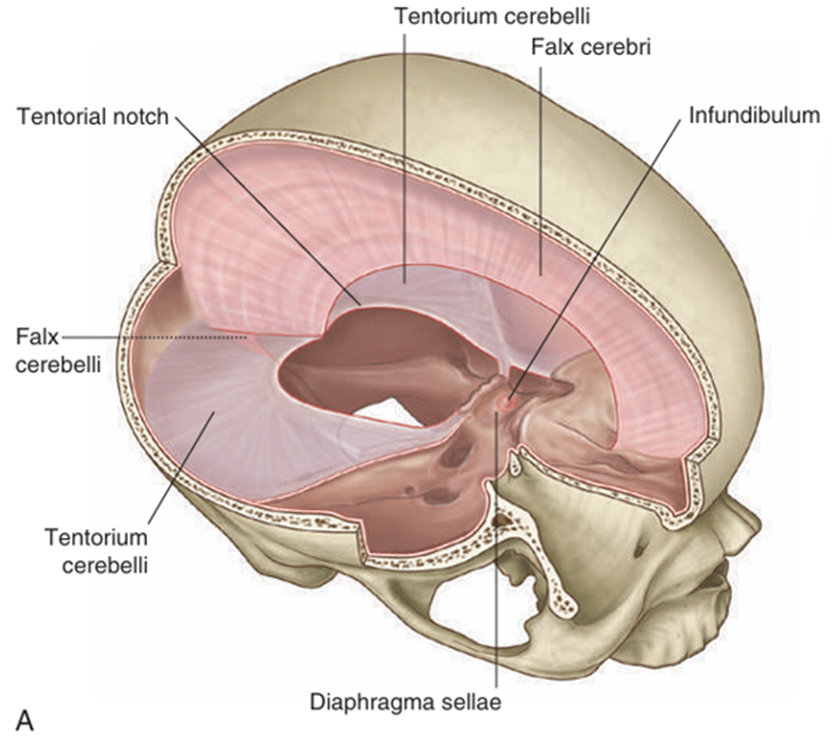 Grays Anatomy for Students 4th ed. pp.862 | • 경막격막(dural partition): 경막이 겹쳐지며 생기는 격막 ① Falx Cerebri (대뇌낫) : 좌우 대뇌 반구 사이 ② Tentorium Cerebelli (소뇌천막) : 대뇌와 소뇌 사이 ③ Falx Cerebelli (소뇌낫) : 좌우 소뇌 반구 사이 ④ Diaphragma sellae (안장가로막) : hypophysial fossa를 덮음 • 중앙에 뇌하수체와 뇌바닥의 연결 통로(infundibulum) 존재 |