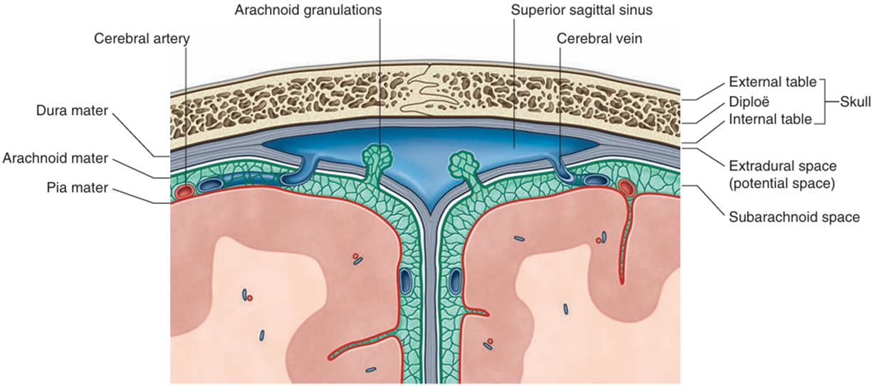 • 거미막과립(arachnoid granulation): 거미막이 경막을 뚫고 경막의 내강 쪽으로 돌출된 구조