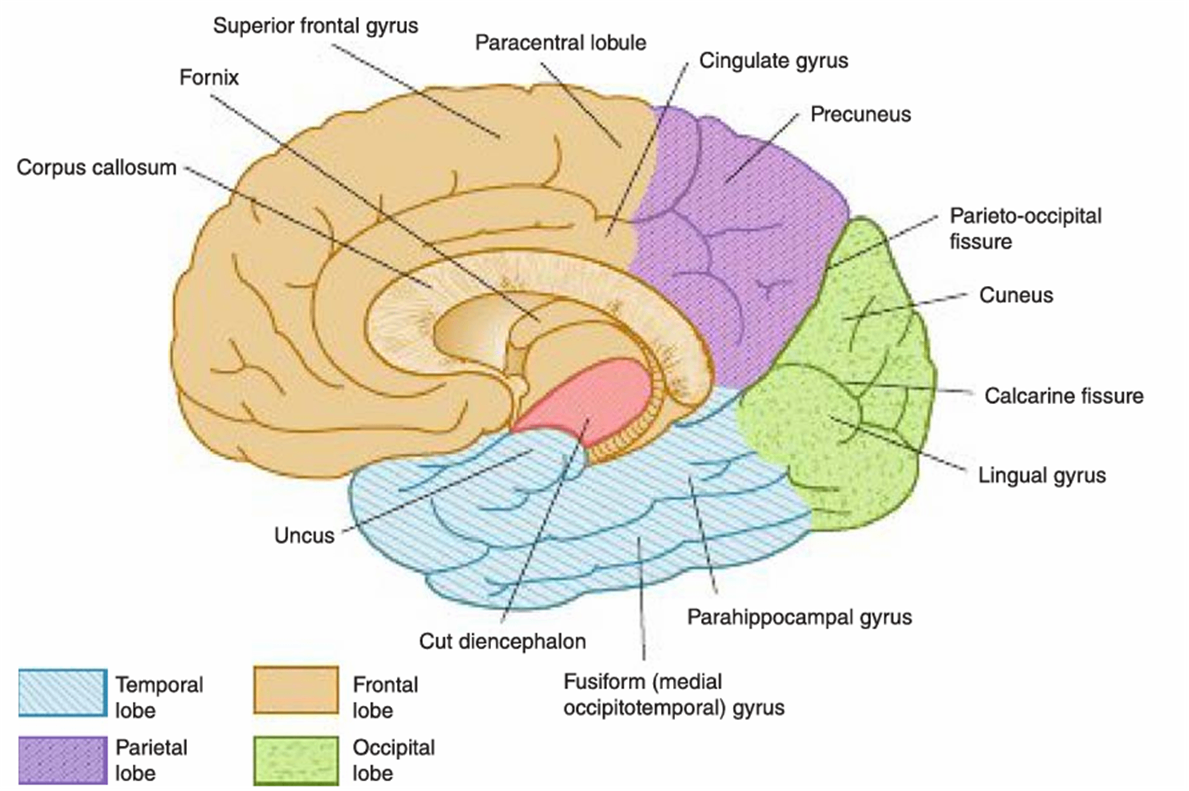 3) 대뇌엽의 종류: 전두엽(frontal), 두정엽(parietal), 측두엽(temporal), 후두엽(occipital), 변연엽(limbic)