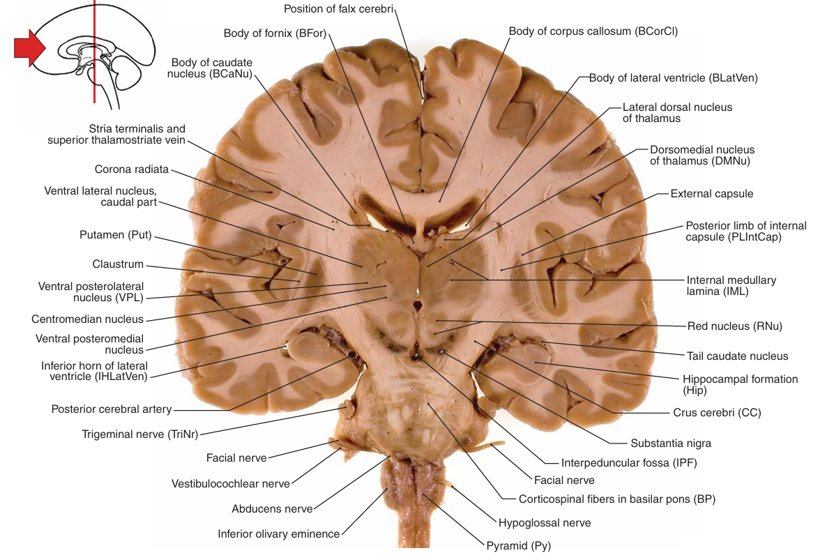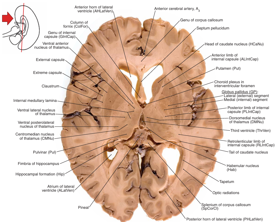 | • 주요 구조 ① 조가비핵(Putamen) ② 시상(Thalamus) ③ 뇌들보(Corpus callosum) ④ 적색핵(Red nucleus) ⑤ 해마형체(Hippocampal formation) ⑥ 흑색질(Substantia nigra) ⑦ 유두체(Mamillary body) ⑧ 꼬리핵(Caudate nucleus) |