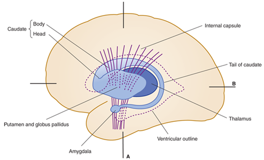 | • 주요 구조 ① 꼬리핵(Caudate nucleus) ② 대뇌섬(Insula) ③ 창백핵(Globus pallidus) ④ 조가비핵(Putamen) ⑤ 시상(Thalamus) ⑥ 바깥섬유막(External capsule) |