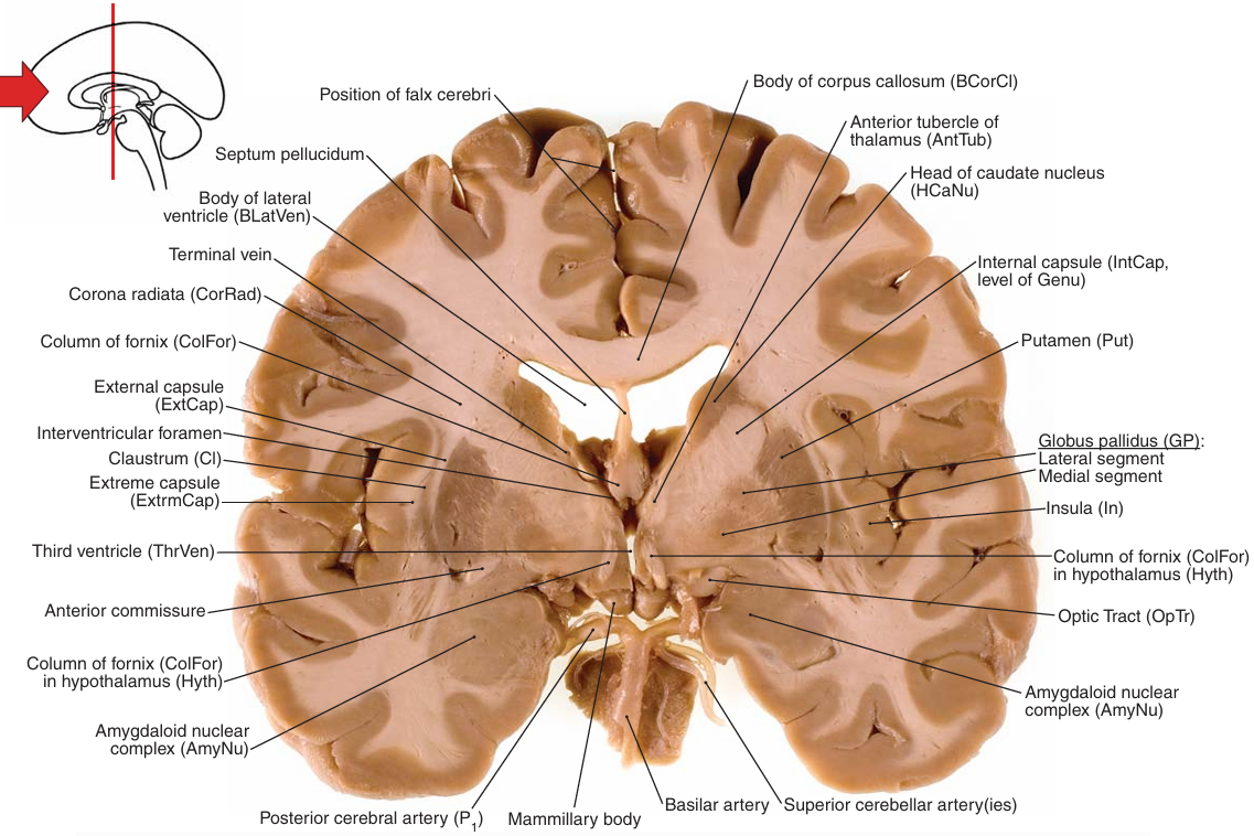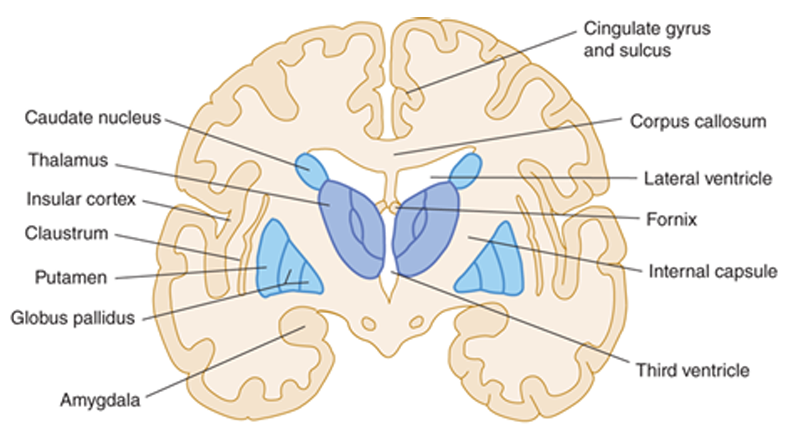 | • 주요 구조 ① 조가비핵(Putamen) ② 창백핵(Globus pallidus) ③ 대뇌섬(Insula) ④ 시상(Thalamus) ⑤ 꼬리핵(Caudate nucleus) ⑥ 바깥섬유막(External capsule) ⑦ 유두체(Mamillary body) |