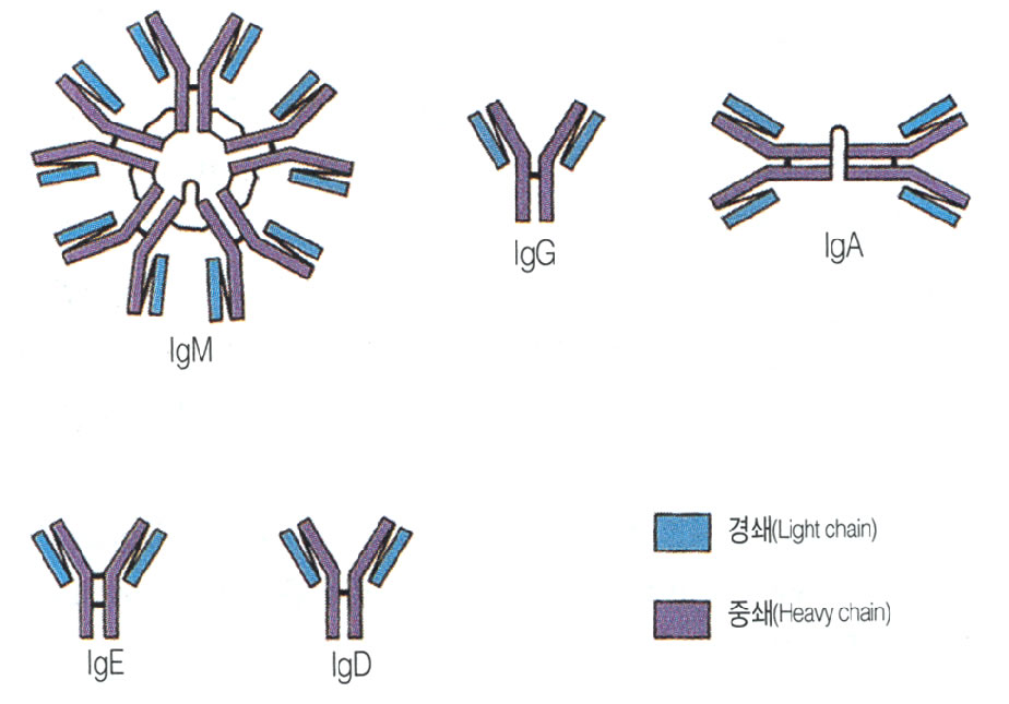 IgD | B세포 표면 수용체 | Monomer (1) | B세포 표면 | 혈중 농도 매우 낮음 정확한 기능 불명확 |