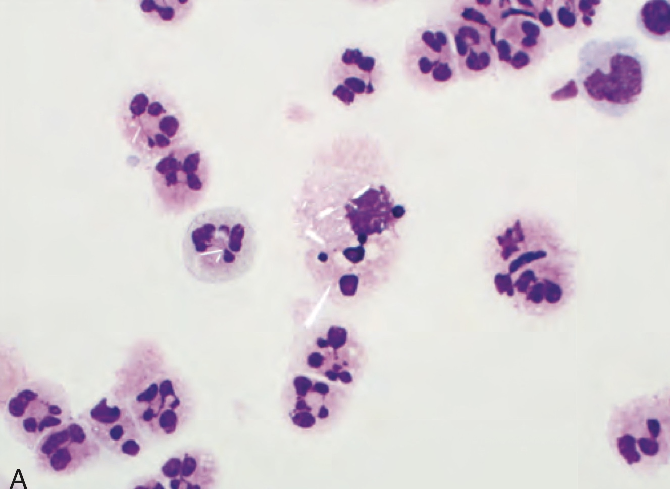 • 급성 관절염 발생 시, 활막과 활액 내에 dense neutrophilic infiltrate이 관찰됨. 또한 가느다란 바늘 모양의 요산 결정(urate crystals)이 활막 내에 작운 군집을 이루며, 관절액 표본에서는 이러한 결정이 호중구의 세포질 내에서도 발견됨