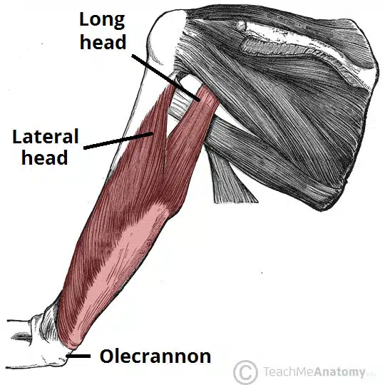 3) 기능: 팔꿉관절 펴기에 관여