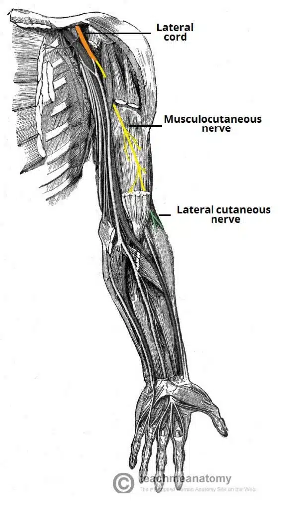 1) 근육피부신경(musculocutaneous nerve): 앞쪽 구획의 근육 지배