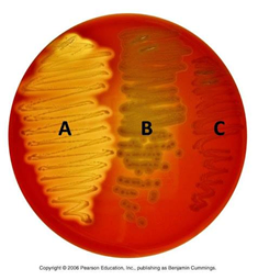 A: β 용혈 / B: α 용혈 / C: γ 용혈