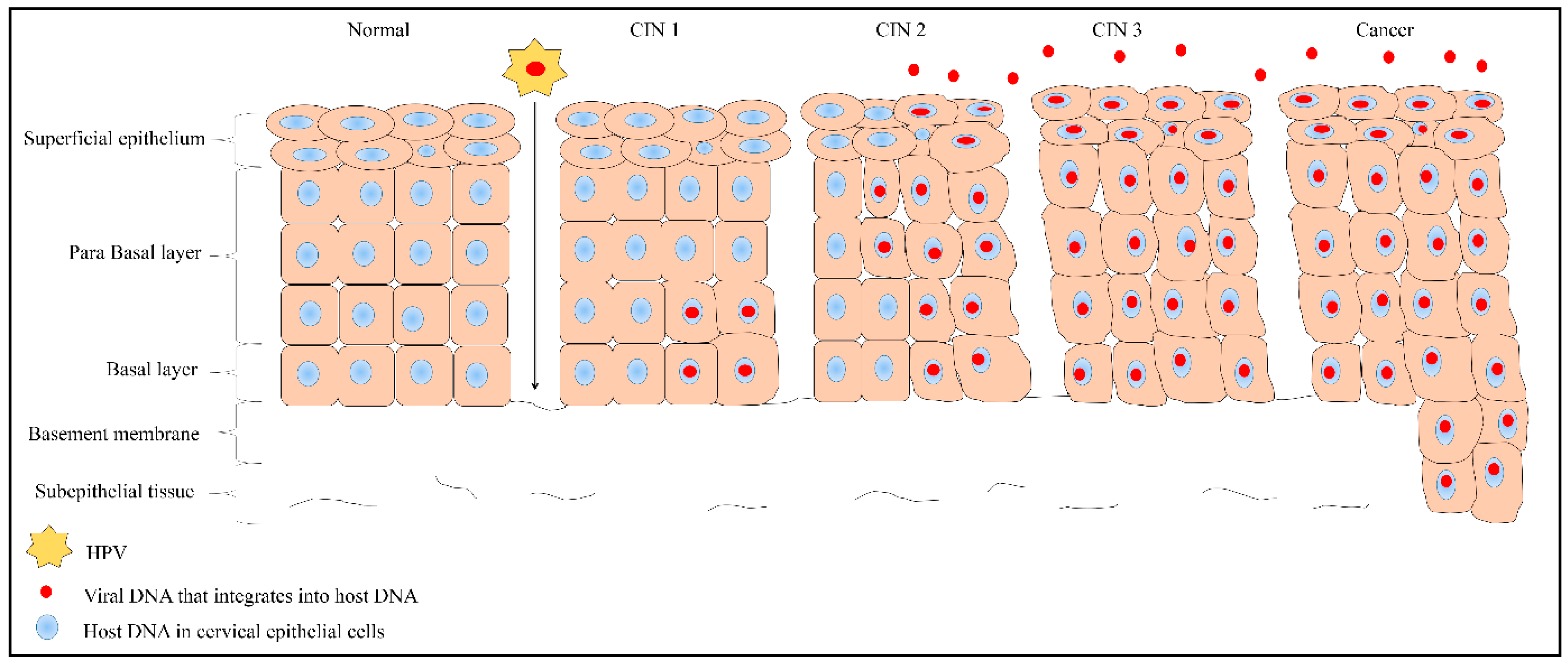 1) 성교 후 생긴 자궁경부의 상처를 통해 HPV가 들어와 basal cell layer(줄기세포)에 감염을 일으키고, tumor suppressor gene을 억제하는 게놈을 숙주 염색체에 삼입하여 상피세포들이 비정상적으로 증식하여 종양이 발생한다.