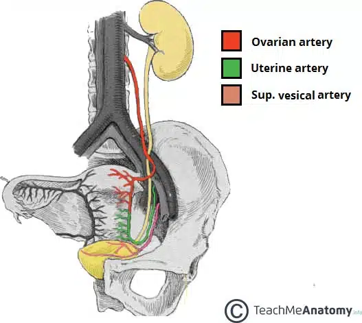 2) 자궁동맥, 자궁관, 자궁원인대가 요관을 가로지르므로, 자궁절제술 중 요관 손상 위험이 높음