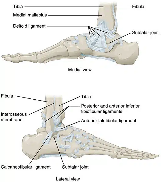 - 가장 취약한 인대: Anterior talofibular lig. (Lateral lig.가 medial보다 약함 + inversion 시 긴장됨)
