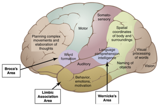 1) 브로카 영역: 말하기, 문장 구성 담당. 이 영역 손상 시 브로카 실어증 발생