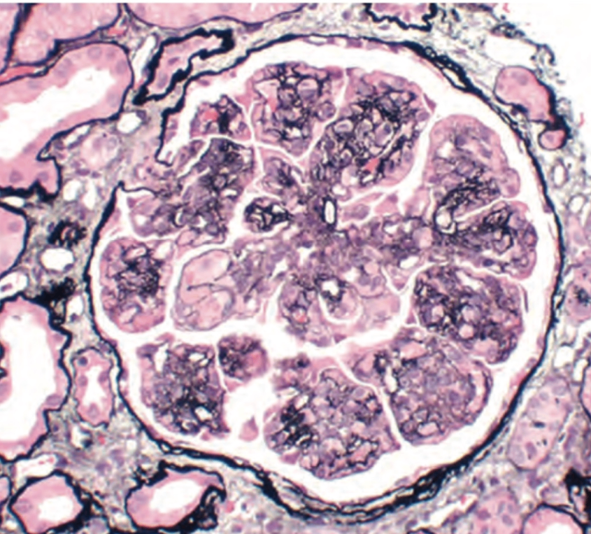 • Mesangial matrix이 두꺼워져 사구체가 엽상(lobular) 구조를 띔