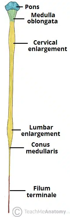 5) 표면에 anterior median fissure, posterior median sulcus 두 개의 함몰부가 있으며, 말단에서 종말끈(filum terminale)을 통해 꼬리뼈(coccyx)에 부착된다.