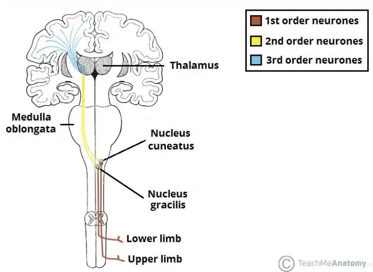 • 상지(T6 이상): fasciculus cuneatus → nucleus cuneatus (medulla)