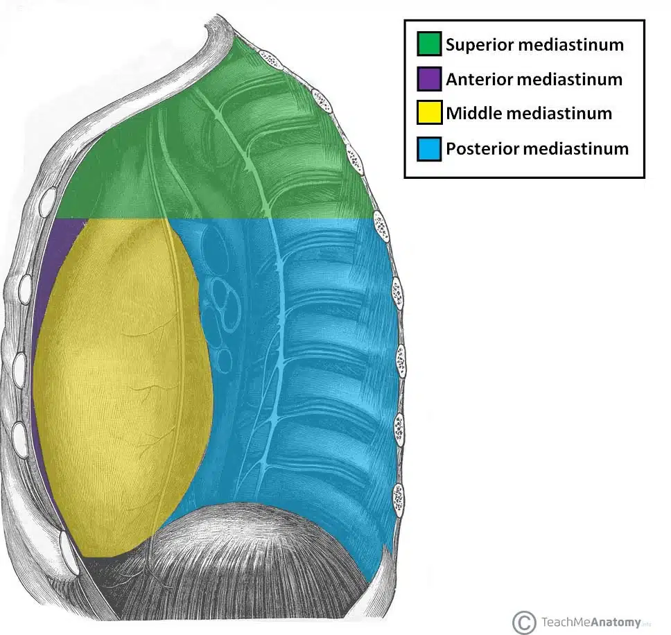 Posterior | Vertebral body 앞, Middle 뒤 | Thoracic aorta, Esophagus, Thoracic duct, Azygos vein, Sympathetic trunk 및 thoracic splanchnic nerves 등 |