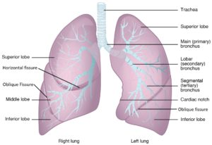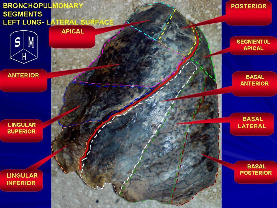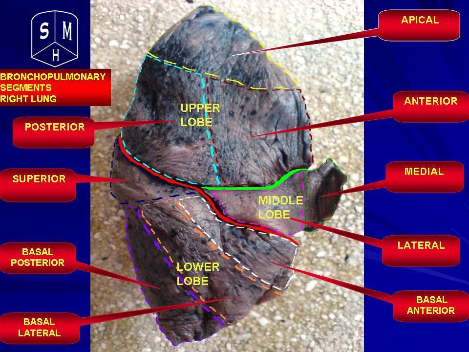 폐엽 (Lobes) | 우폐: 3엽 (superior, middle, inferior), 2개 fissure (oblique, horizontal) 좌폐: 2엽 (superior, inferior), 1개 fissure (oblique) |