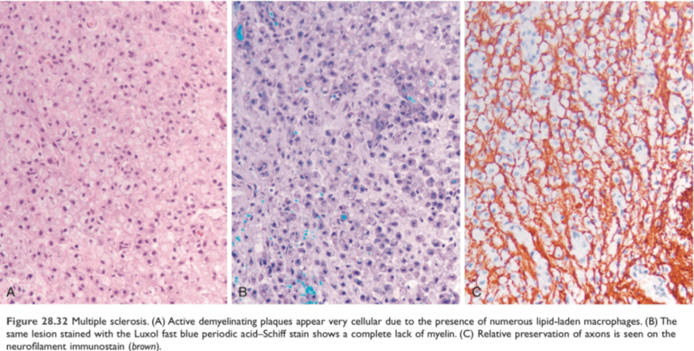 • Active lesion: myelin의 소실과 함께 거품세포(foamy macrophage)가 풍부하게 관찰됨