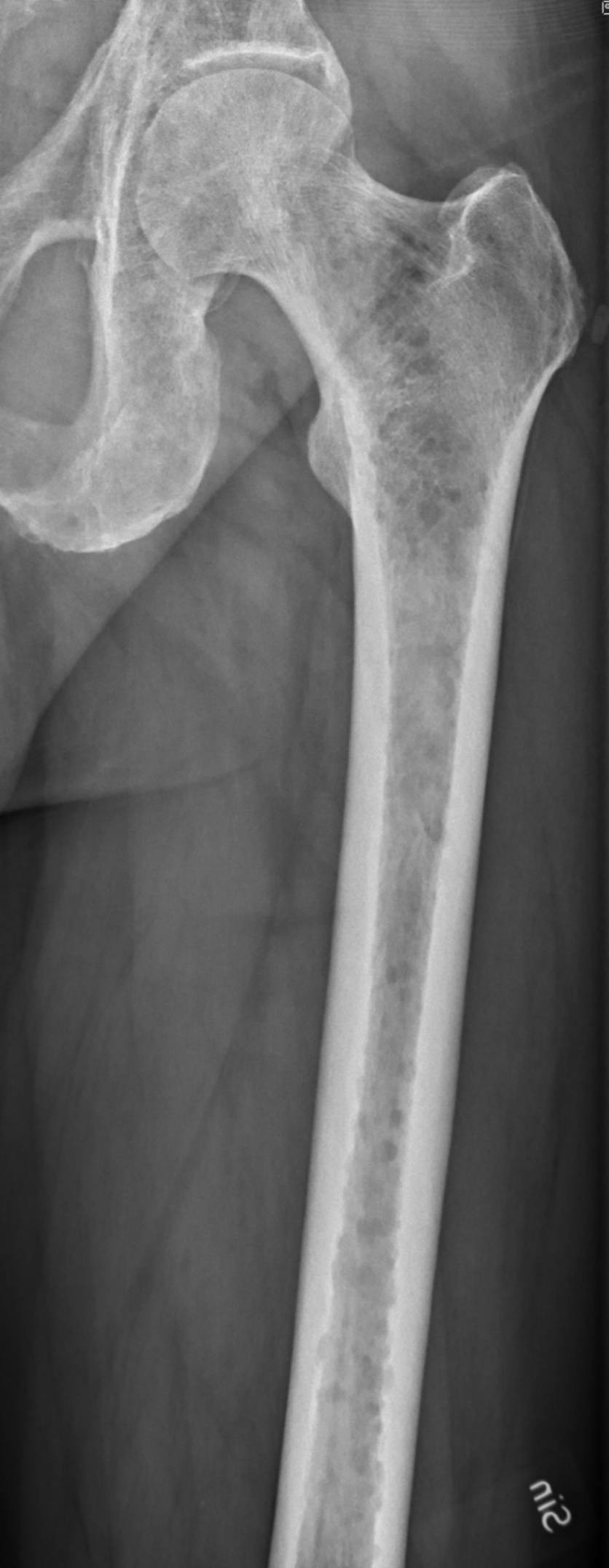 → 골수강에서 시작해 피질골을 침식하며 “punch-out 병변”(1–4cm 크기)의 방사선 소견을 보임 Left femur with myeloma, Wikimedia Commons