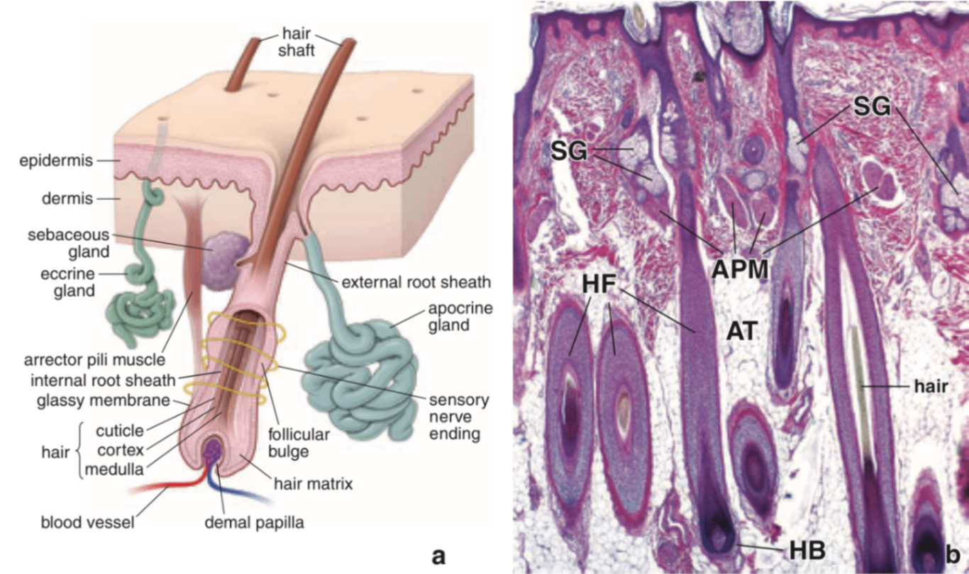 • Hair follicle: 모발을 둘러싸고 있는 관 모양 구조물.