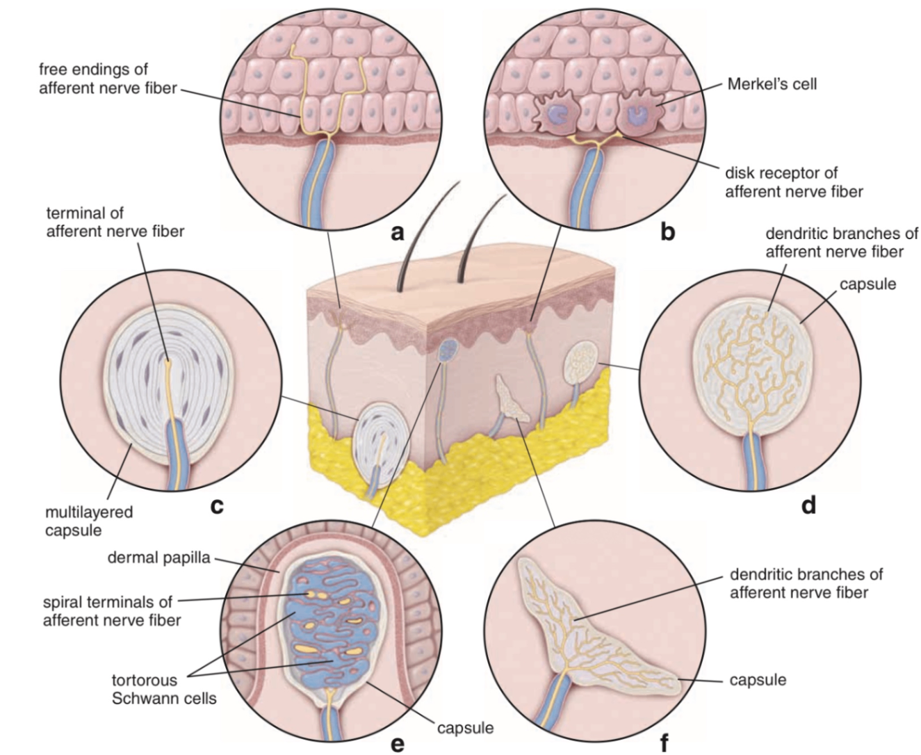 Pacinian Corpuscle | 진피 깊은 층 또는 피하조직(subcutaneous tissue), 관절, 장기 | 깊은 압력, 고주파 진동 (250~300Hz) | 양파 모양의 층상 구조(lamellated corpuscle) |