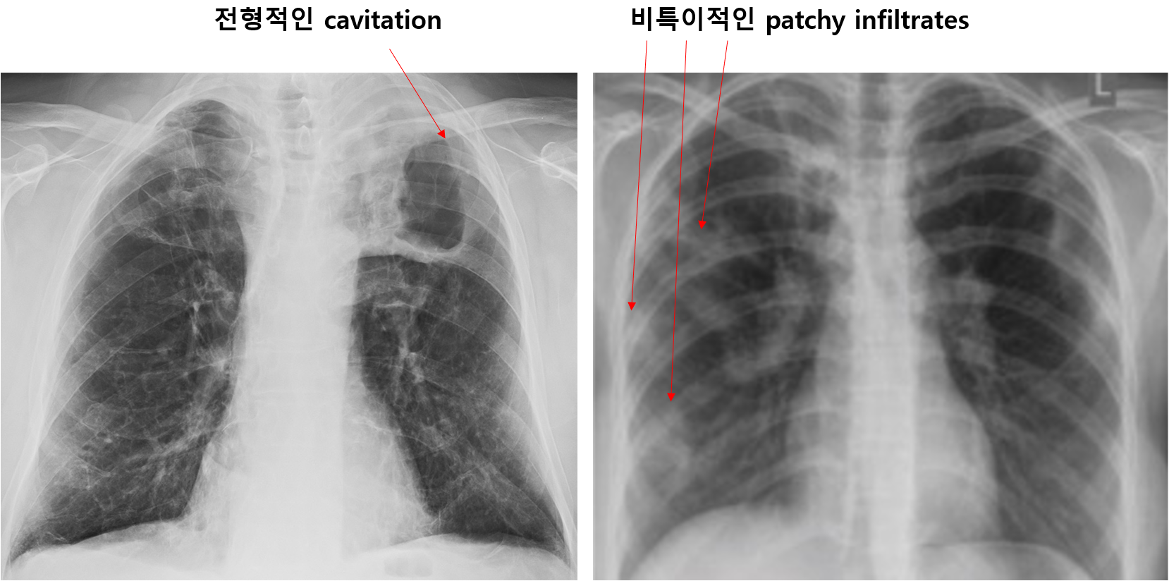 * 과거에는 결핵균 감염부터 발병까지의 시간에 따라 흉부 X선 소견이 달라지는 것으로 생각했으나, 실제로는 환자의 면역 상태가 더 중요하다는 것이 밝혀졌다. 면역상태가 정상인 환자에서는 상엽에 공동을 동반하는 형태의 폐결핵이 주로 발생하고, 면역저하자에서는 폐하엽을 침범하며 림프절염과 흉막염을 동반하는 폐결핵이 주로 발생한다.