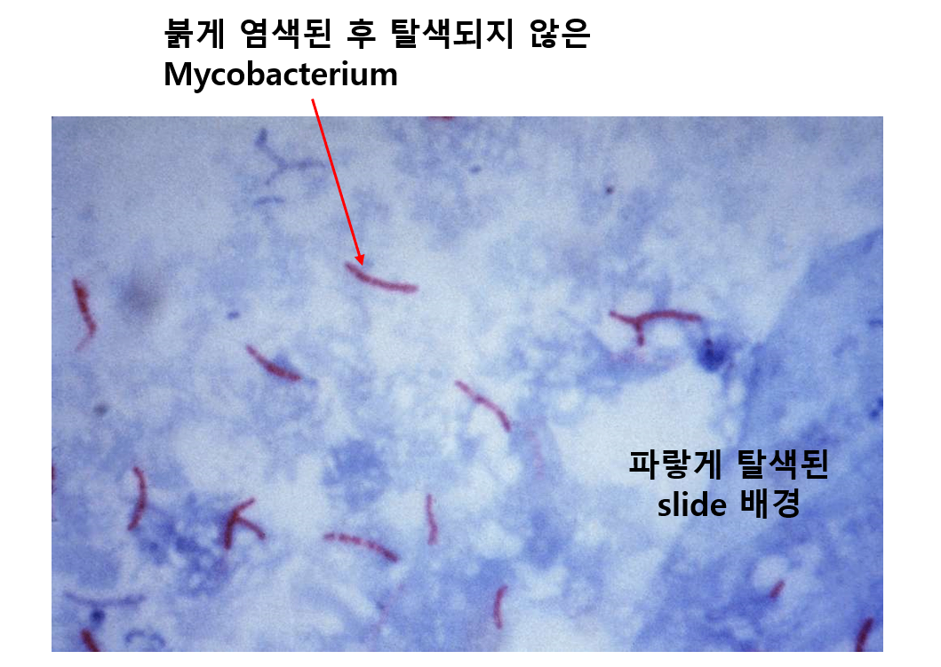 ③ Acid alcohol로 슬라이드 전체를 탈색 → Mycobacterium만 탈색되지 않음
