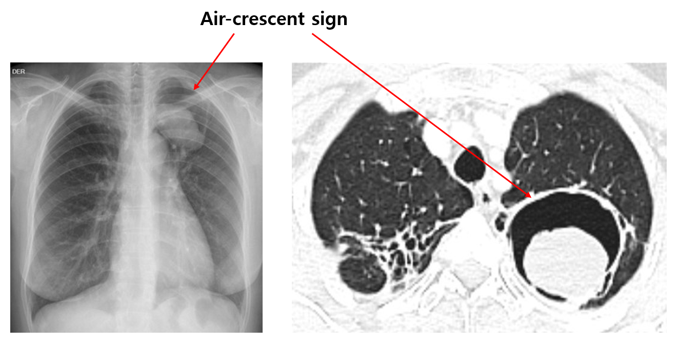 (3) 검사소견: CXR/CT - air-crescent sign