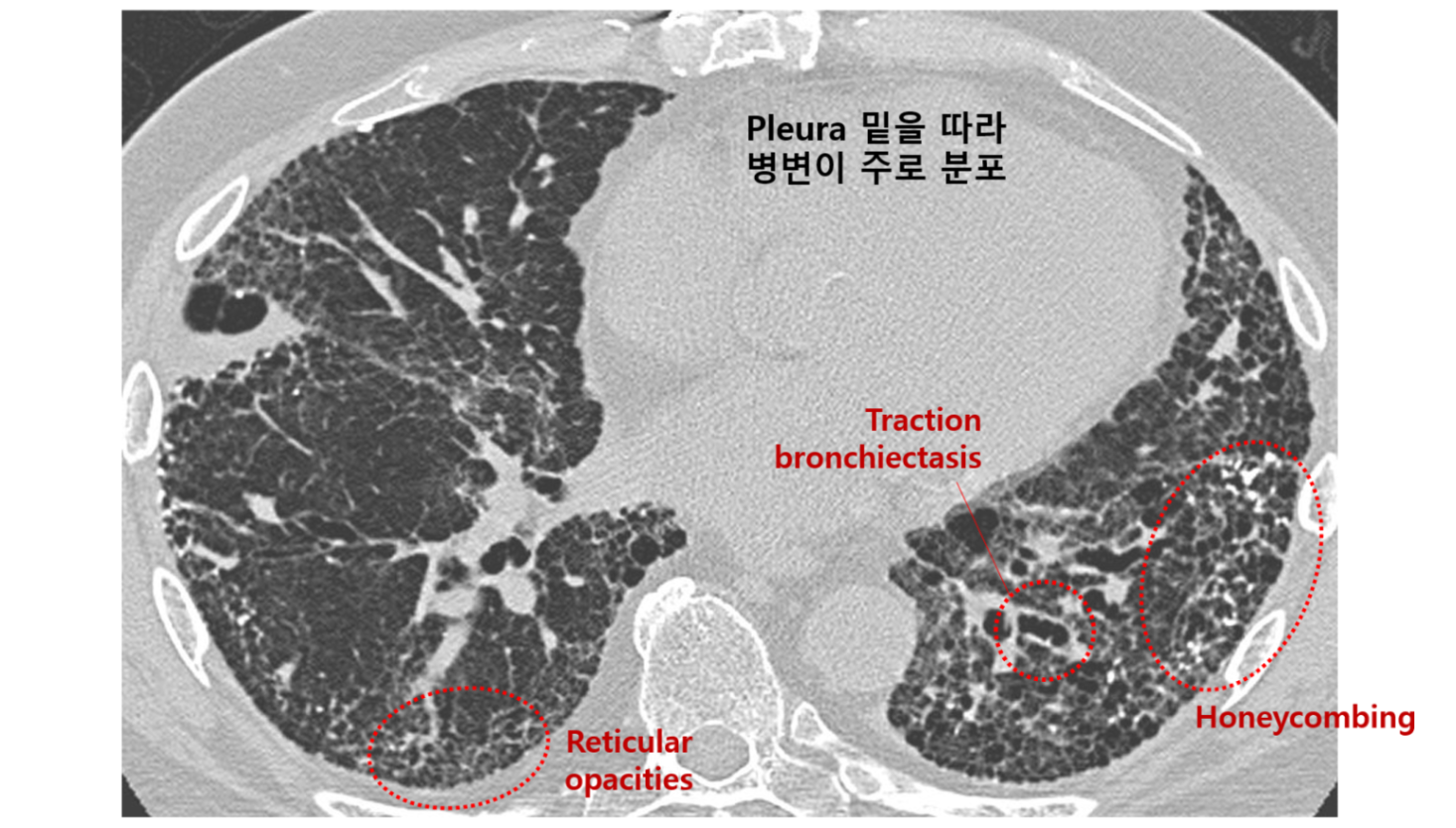 * 위와 같은 영상학적 소견을 통상간질성폐렴(usual interstitial pneumonia, UIP)이라고 부른다. UIP는 CTD, 약물, 직업성 노출 등으로 인한 ILD에서도 확인될 수 있으므로 해당 원인들을 배제해야 IPF로 진단할 수 있다.