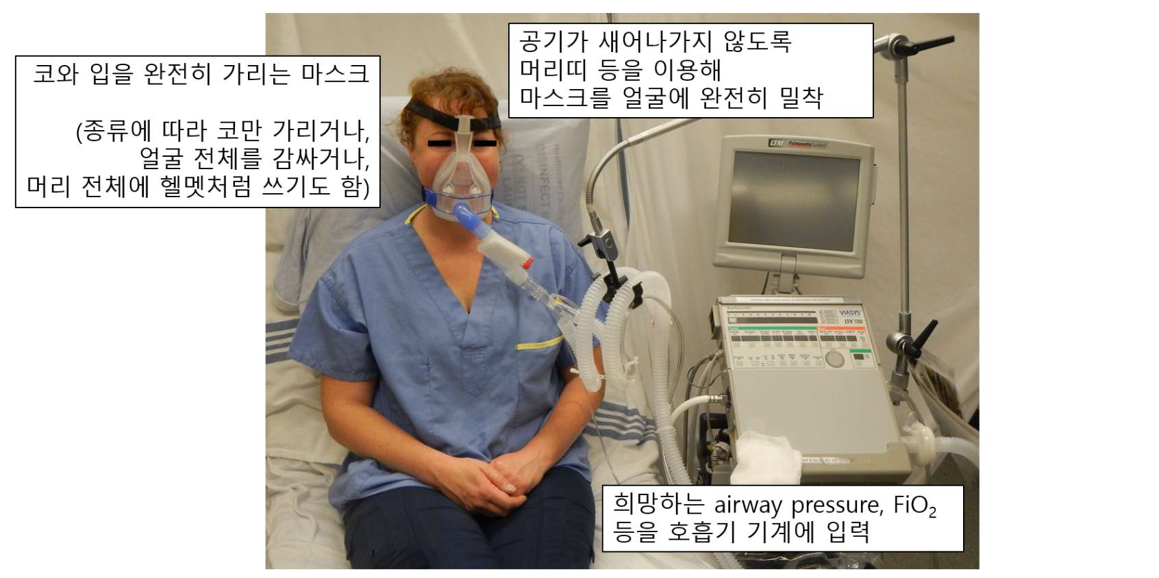 (2) 환자가 공기를 들이마쉬고 내쉬는 능력이 부족하니 밀착된 마스크를 통해 공기를 불어넣어주는 호흡 보조 요법