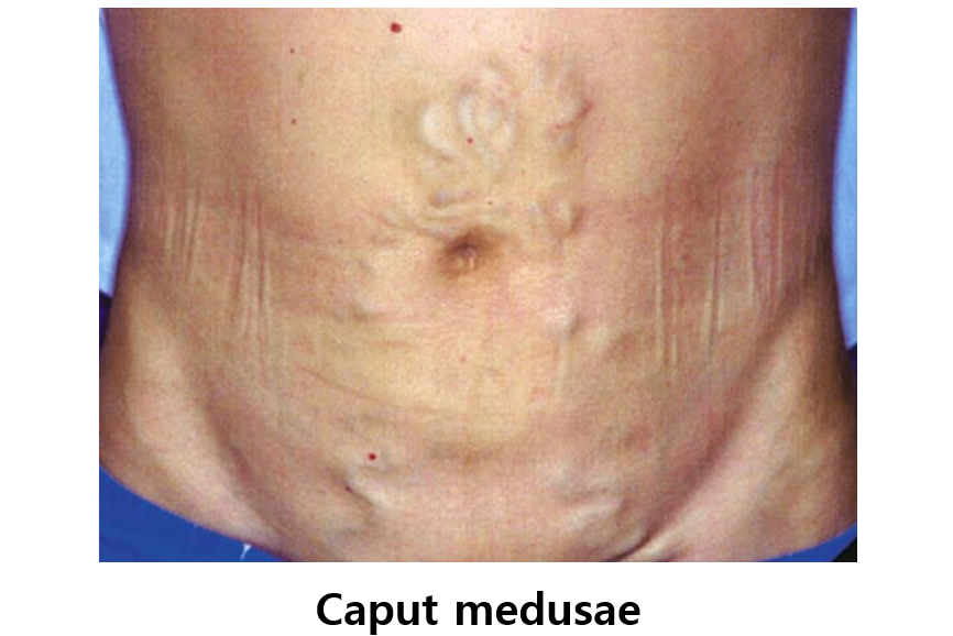 (3) Caput medusae: 문맥 고혈압으로 인해 umbilical vein이 재개통되며 복부 표재성 혈관이 발달됨