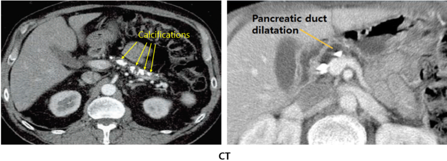 (2) CT: Pancreatic calcifications, pancreatic duct dilatation, atrophic pancreas