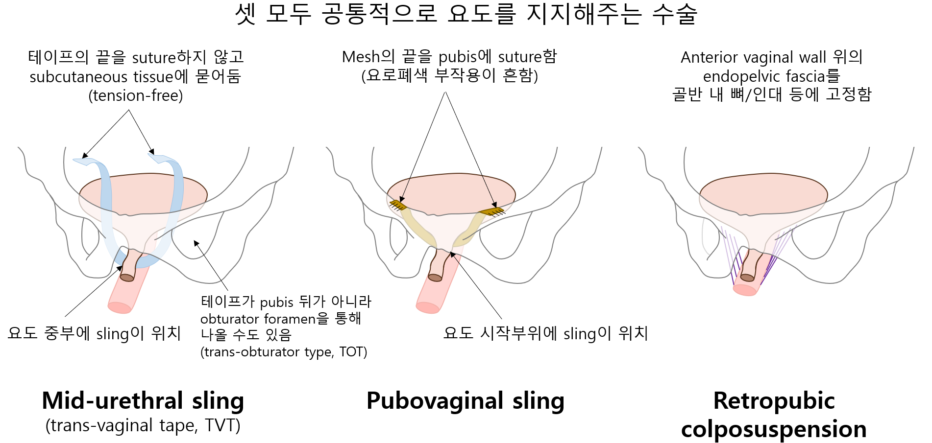 수술(보존적/약물치료 실패시) | ① 중부요도 슬링(mid-urethral sling): 주로 우선적으로 고려되는 술식 • 무긴장성 테이프술(tension-free vaginal tape, TVT)이라고도 함 ② 치골질식 슬링(pubovaginal sling) ③ Retropubic colposuspension ④ 충전제(bulking agent) 주입 |