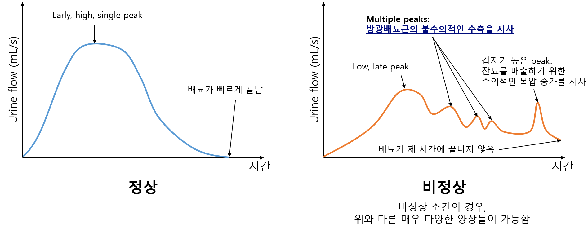 ③ 비정상: 여러 개의 peak, 높이가 낮은 peak, 배뇨 시작으로부터 늦게 발생하는 peak 등