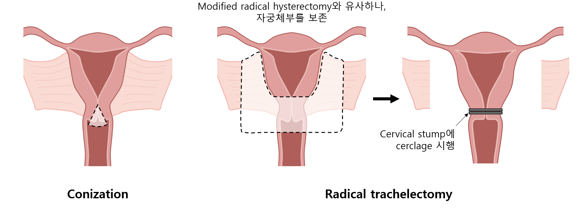 ② 근치자궁경부절제술(radical trachelectomy): 변형근치자궁절제술과 유사하나, 자궁체부는 남기고 cervical stump에 결찰 시행