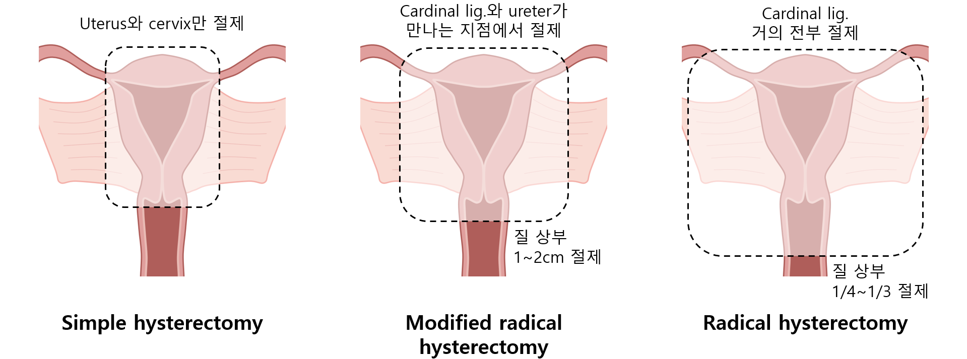 (3) 근치자궁절제술(radical hysterectomy): Cardinal ligament 거의 전부, 질 상부 1/4~1/3 추가 절제
