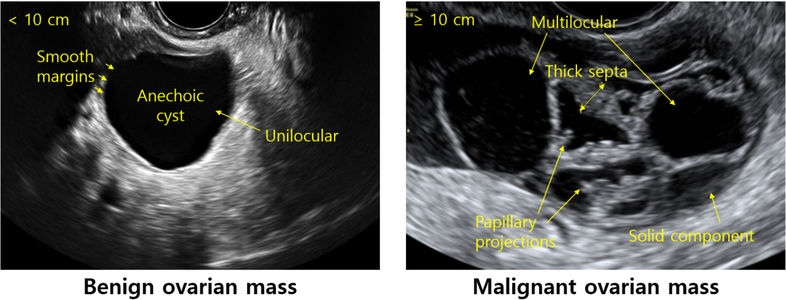 * 국시의 경우 대부분 양성/악성 여부가 비교적 명확한 증례들이 출제되지만, 실상은 애매한 경우들이 많다. 환자의 연령(특히 폐경 여부), 증상의 유무, CA-125 수치 등을 종합적으로 판단해야 하며, 초음파 소견도 악성 가능성을 5단계로 구분하는 O-RADS system이 존재한다. 국시 수준에서 필요하다고 보기는 어렵다.