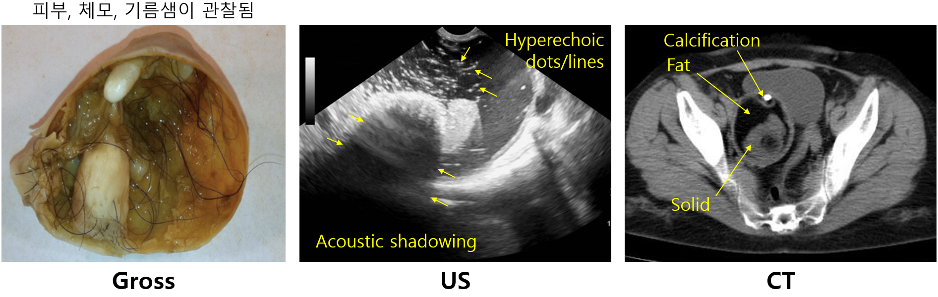 * 양성 기형종(benign teratoma)이라고도 하며, 유피낭종(dermoid cyst, 피부모양낭종)이라고도 한다.