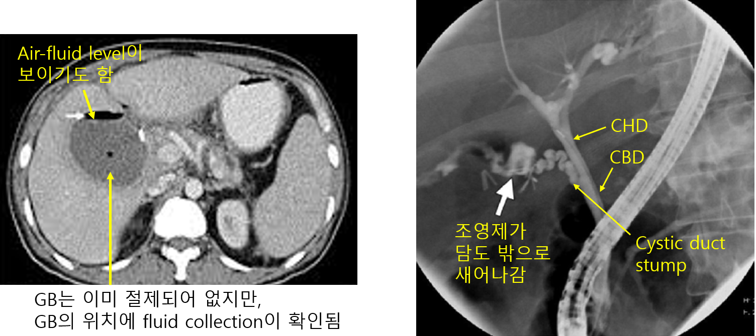 • Cystic duct stump에서 누출 확인 → CBD stent 삽입