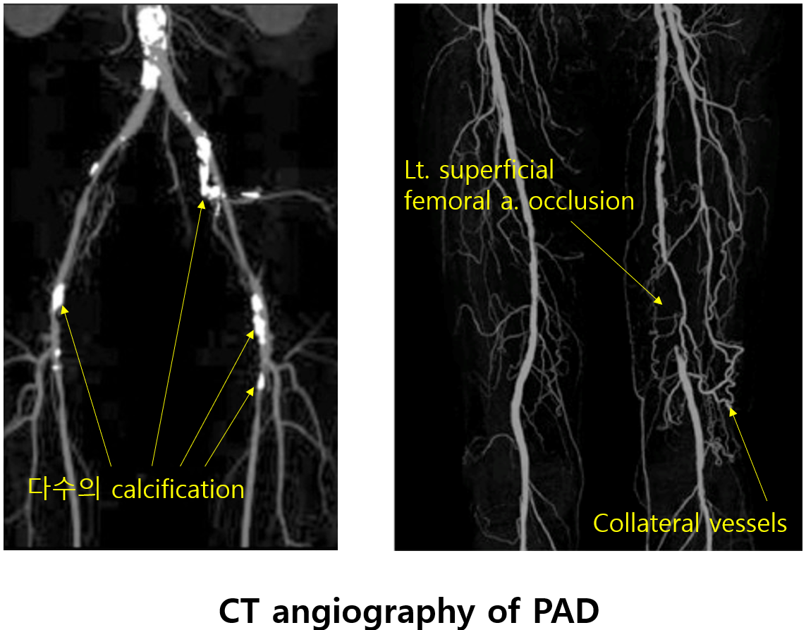임상양상 | • 다리 통증 - 혈관성 파행 (운동 시 악화, 휴식 시 완화) • Bruit 청진, 원위부 맥박 감소, 차갑고 창백한 피부 등 |