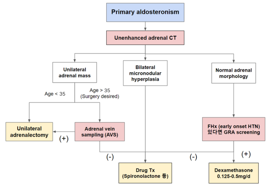 (3) 정상: Glucocorticoid remediable aldosteronism 고려 (드묾)