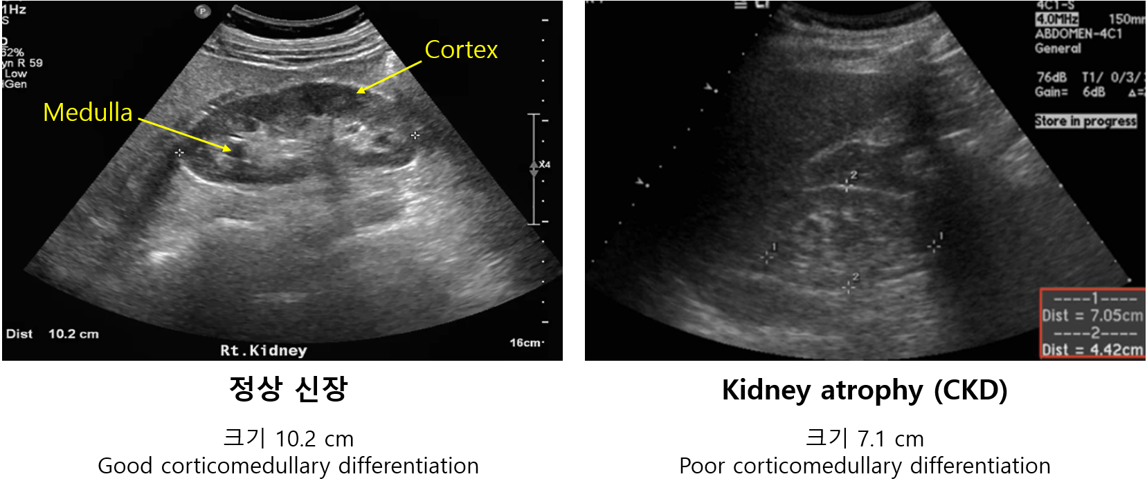 * 이밖에도 renal cortical thickness 감소(<6 mm), marginal irregularities와 같은 다양한 소견들이 CKD 환자의 초음파에서 관찰될 수 있다.